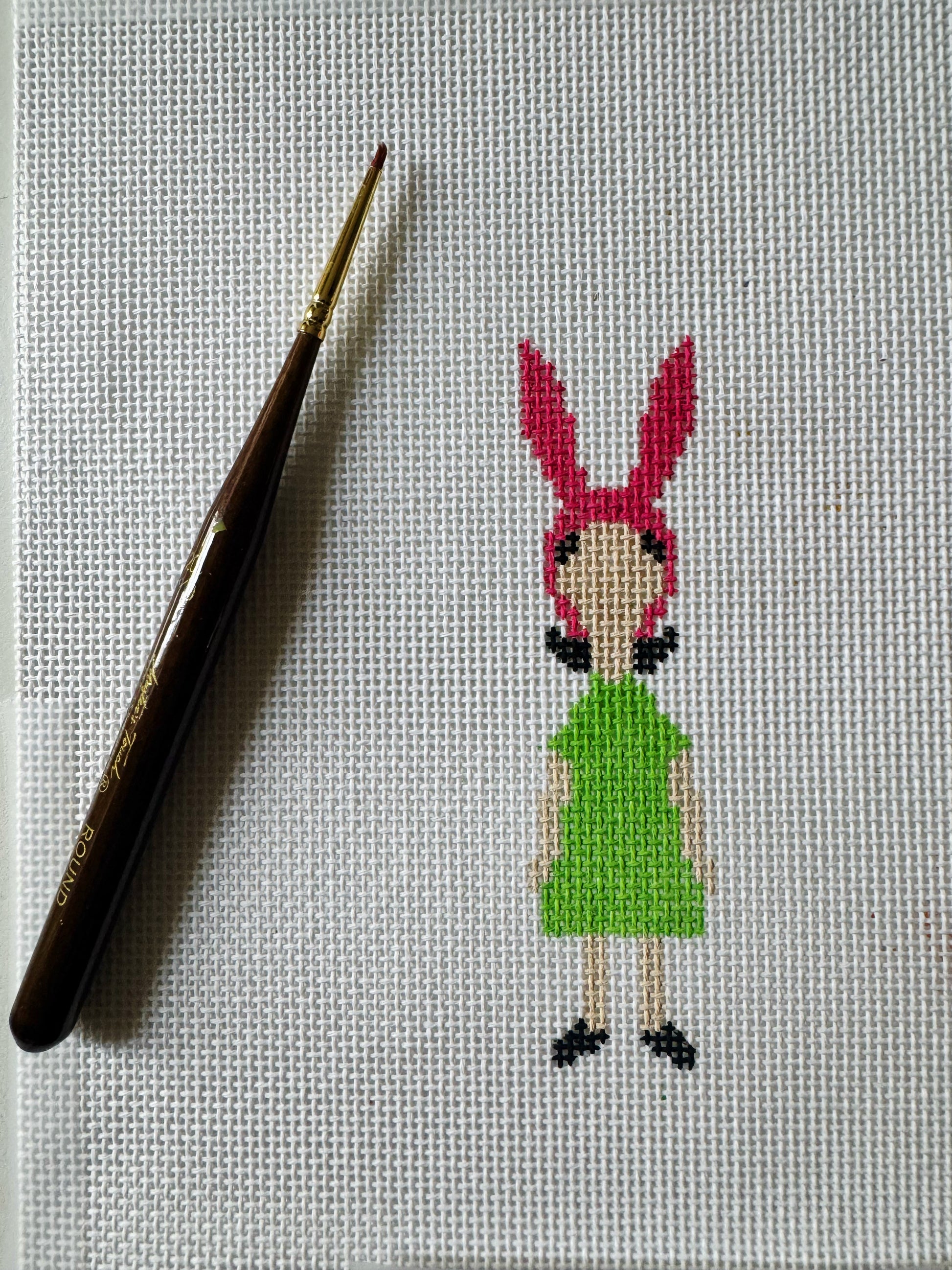 Capture the quirky charm of Louise Belcher with this hand-painted needlepoint canvas, featuring an 18-count mesh and measuring 4x1 inch. Perfect for adding a playful stitch to your collection!
